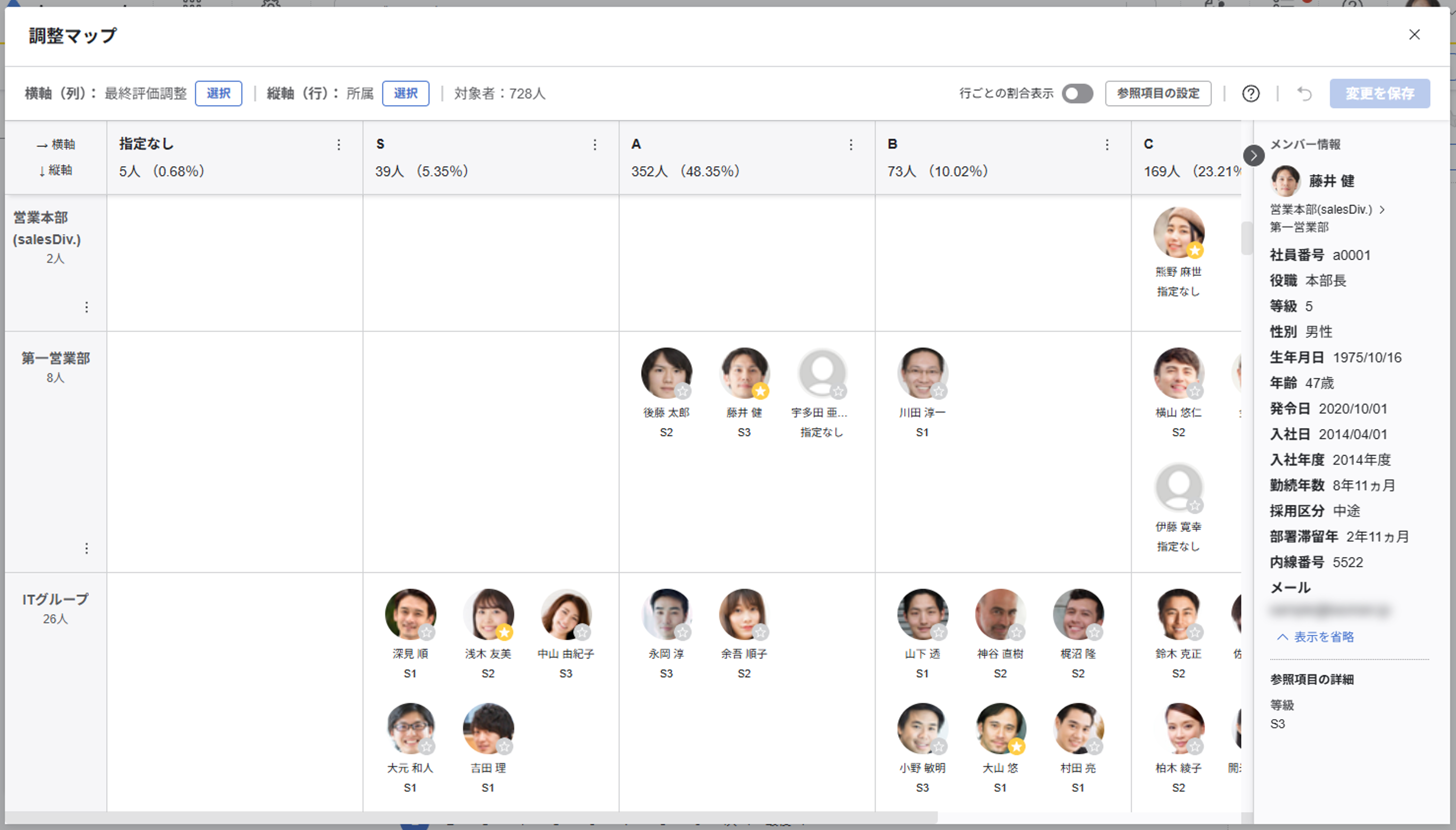 特に、 管理職や経営層、評価会議に参加する方々からは「評価がめちゃくちゃ早くなった」と好評をいただいています。特にカオナビの『調整マップ』という機能は、画面を見せた時に「すごい!便利!」という声が上がりました。