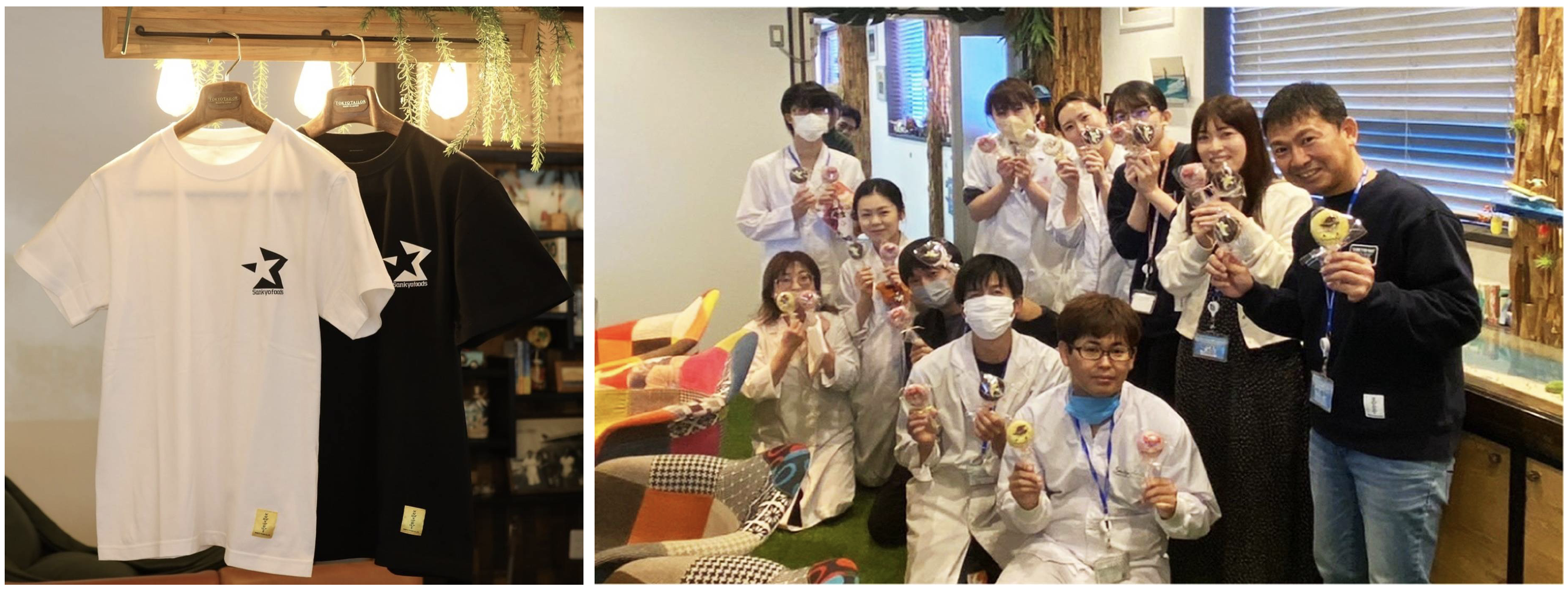 社員は自由な服装で出社している。左は、会社支給のオリジナルTシャツ(写真提供:三共食品)