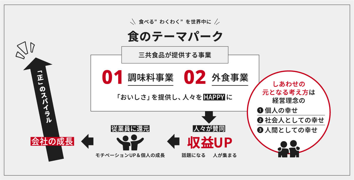 そこで、理念の浸透を改革の柱の一つに据えることにしたんです。まず、「食べる”わくわく”を世界中に」という、誰にとっても理解しやすいキャッチコピーを新たに作りました。食を通じて世界中の人たちを笑顔にしたい、その思いをシンプルな言葉に凝縮したものです。それを念頭に、 自分たちの仕事がどのように「しあわせ」につながるのかを図解し、要所要所で伝えるようにしました。