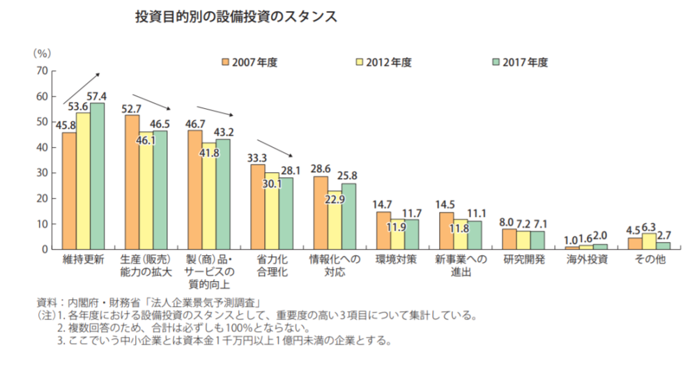 中小企業の設備投資は、緩やかな回復傾向にあるものの、まだリーマンショック前の水準には達していません。くわえて、設備投資の目的が、設備の維持更新に向いており、生産能力の拡大や付加価値向上といった方向性には向いていないのです。つまり、設備が老朽化しており、事業を継続するためにやむなく設備投資するという姿勢がうかがえます。