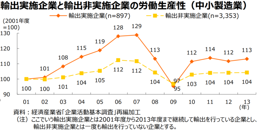 輸出実施企業のほうが、輸出非実施企業より生産性が高いことも分かってきました。輸出実施企業はリーマンショック時に労働生産性を大きく下げたものの、その他の年度では輸出非実施企業より労働生産性が高い状況にあります。
