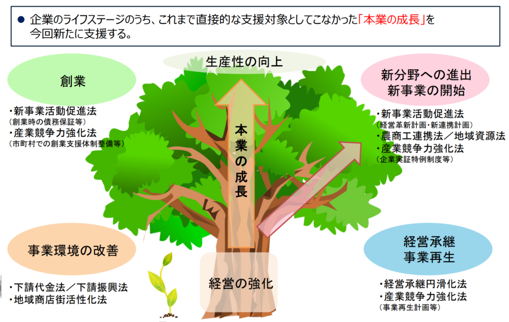 その特徴は、従来重視されてきた創業や事業承継、新規事業に対し、支援の軸先を「本業の成長」に定め生産性向上を実現しようとしていることにあります。