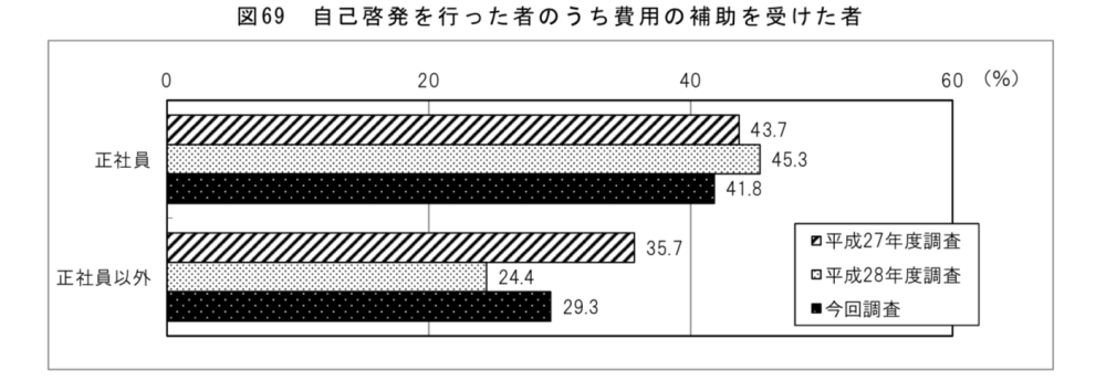 先の厚生労働省調査によると、自己啓発を行った従業員のうち、企業側から費用補助を受けた人は、正社員で41.8%、正社員以外でも29.3%である事がわかりました。